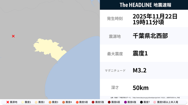11月22日19時11分頃、千葉県北西部を震源とするマグニチュード3.2の地震が観測された。最大震度1を観測したのは、千葉県。