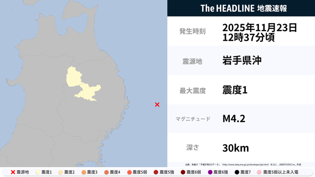 11月23日12時37分頃、岩手県沖を震源とするマグニチュード4.2の地震が観測された。最大震度1を観測したのは、岩手県。