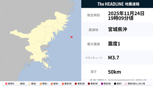 11月24日19時9分頃、宮城県沖を震源とするマグニチュード3.7の地震が観測された。最大震度1を観測したのは、岩手県・宮城県。