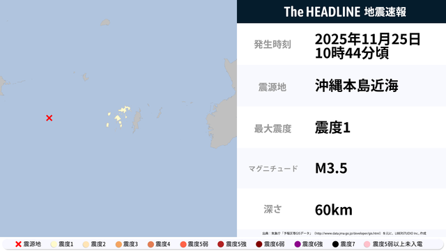 11月25日10時44分頃、沖縄本島近海を震源とするマグニチュード3.5の地震が観測された。最大震度1を観測したのは、沖縄県。
