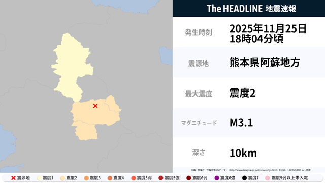 11月25日18時04分頃、熊本県阿蘇地方を震源とするマグニチュード3.1の地震が観測された。最大震度2を観測したのは、熊本県。