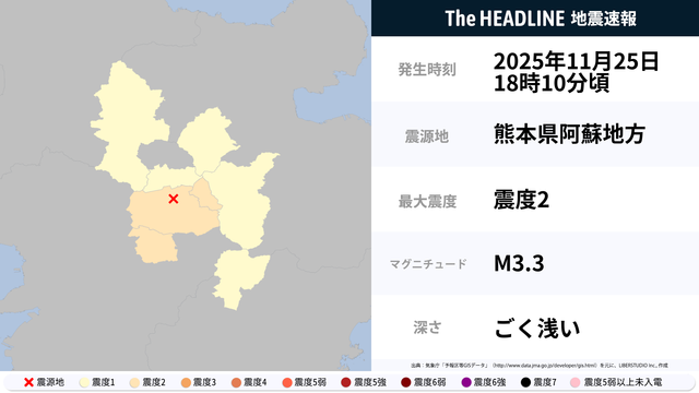 11月25日18時10分頃、熊本県阿蘇地方を震源とするマグニチュード3.3の地震が観測された。最大震度2を観測したのは、熊本県。