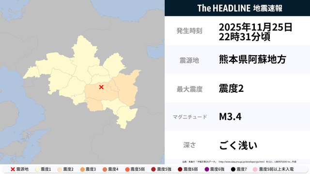 11月25日22時31分頃、熊本県阿蘇地方を震源とするマグニチュード3.4の地震が観測された。最大震度2を観測したのは、熊本県・大分県。