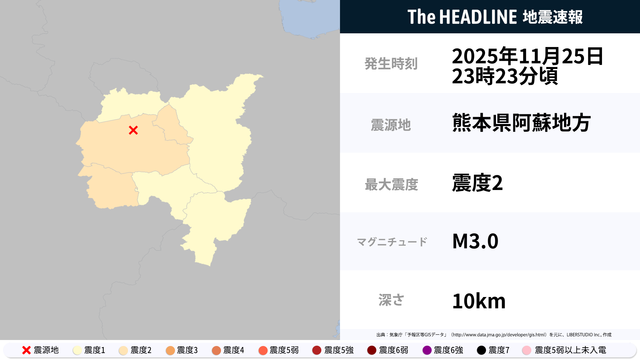 11月25日23時23分頃、熊本県阿蘇地方を震源とするマグニチュード3.0の地震が観測された。最大震度2を観測したのは、熊本県。