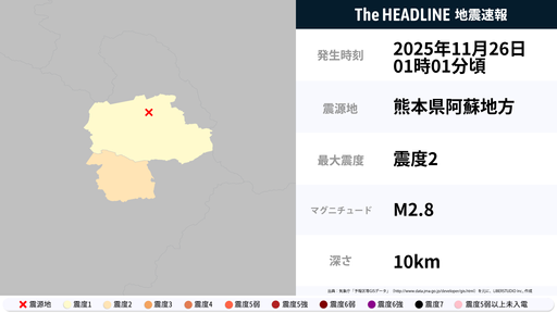 11月25日23時41分頃、熊本県阿蘇地方を震源とするマグニチュード2.8の地震が観測された。最大震度2を観測したのは、熊本県。