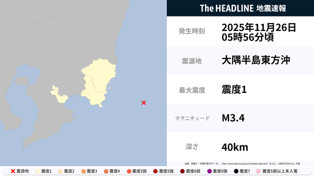 11月26日05時56分頃、大隅半島東方沖を震源とするマグニチュード3.4の地震が観測された。最大震度1を観測したのは、宮崎県・鹿児島県。