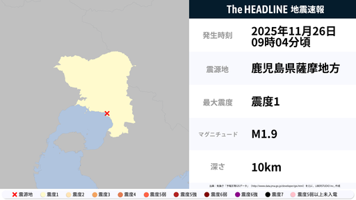 11月26日5時56分頃、宮崎県・鹿児島県で最大震度1の地震を観測