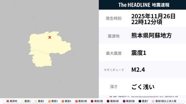 11月26日22時12分頃、熊本県阿蘇地方を震源とするマグニチュード2.4の地震が観測された。最大震度1を観測したのは、熊本県。