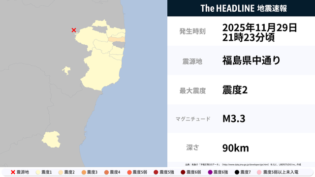11月29日21時23分頃、福島県中通りを震源とするマグニチュード3.3の地震が観測された。最大震度2を観測したのは、福島県。
