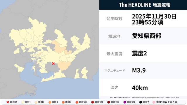 11月30日23時55分頃、愛知県西部を震源とするマグニチュード3.9の地震が観測された。最大震度2を観測したのは、長野県・岐阜県など。