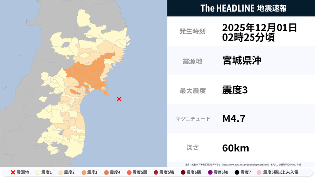 12月1日2時25分頃、宮城県沖を震源とするマグニチュード4.7の地震が観測された。最大震度3を観測したのは、岩手県・宮城県。