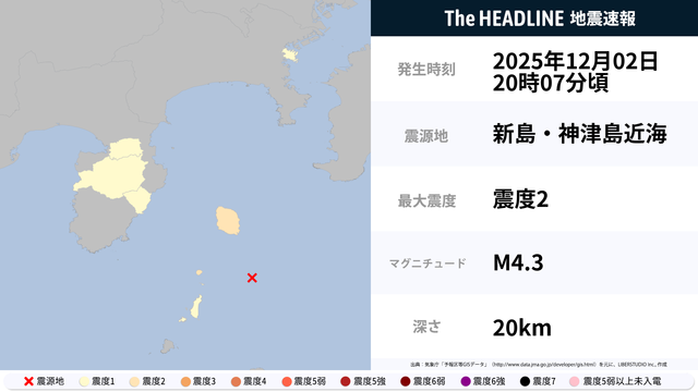 12月02日20時07分頃、新島・神津島近海を震源とするマグニチュード4.3の地震が観測された。最大震度2を観測したのは、東京都。