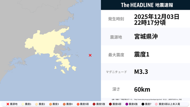 12月03日22時17分頃、宮城県沖を震源とするマグニチュード3.3の地震が観測された。最大震度1を観測したのは、宮城県。
