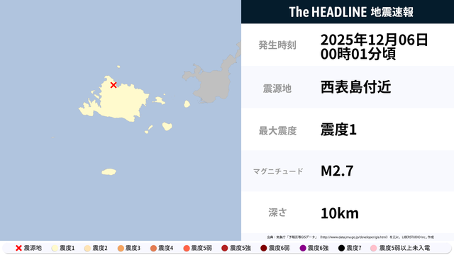 12月06日00時01分頃、西表島付近を震源とするマグニチュード2.7の地震が観測された。最大震度1を観測したのは、沖縄県。
