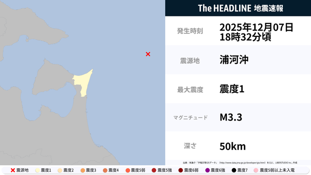 12月7日18時32分頃、浦河沖を震源とするマグニチュード3.3の地震が観測された。最大震度1を観測したのは、青森県。