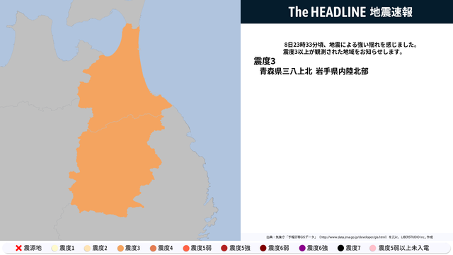 12月8日23時33分頃、青森県・岩手県で震度3以上の地震を観測