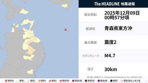 12月8日23時40分頃、青森県で最大震度1の地震を観測