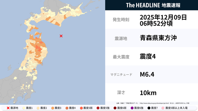 12月9日6時52分頃、青森県・岩手県で最大震度4の地震を観測