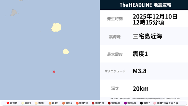 12月10日12時15分頃、三宅島近海を震源とするマグニチュード3.8の地震が観測された。最大震度1を観測したのは、東京都。