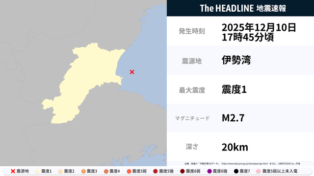 12月10日17時45分頃、伊勢湾を震源とするマグニチュード2.7の地震が観測された。最大震度1を観測したのは、三重県。