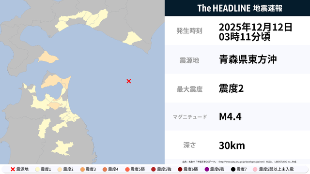 12月12日3時11分頃、青森県東方沖を震源とするマグニチュード4.4の地震が観測された。最大震度2を観測したのは、北海道・青森県。