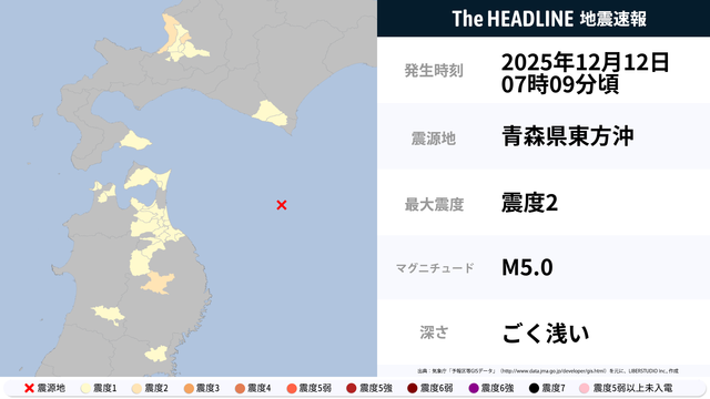 12月12日07時09分頃、青森県東方沖を震源とするマグニチュード5.0の地震が観測された。最大震度2を観測したのは、北海道・岩手県。