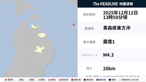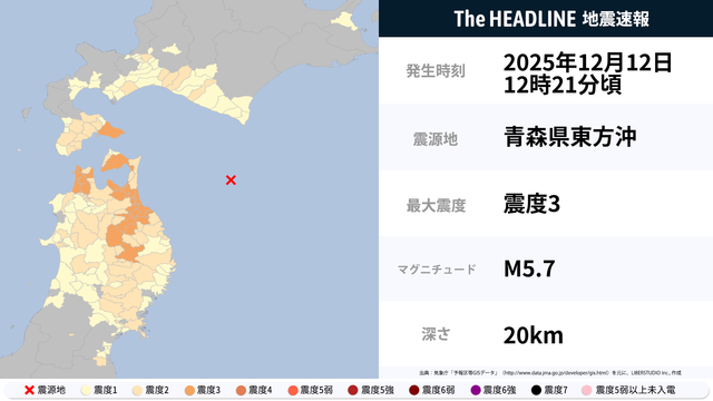 12月12日12時21分頃、青森県東方沖を震源とするマグニチュード5.7の地震が観測された。最大震度3を観測したのは、北海道・青森県など。