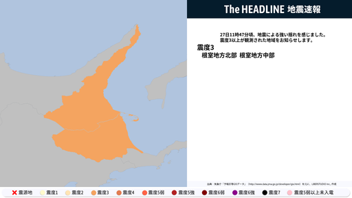 12月12日12時21分頃、北海道・青森県などで最大震度3の地震を観測