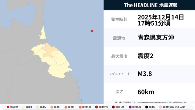 12月14日17時51分頃、青森県東方沖を震源とするマグニチュード3.8の地震が観測された。最大震度2を観測したのは、青森県。