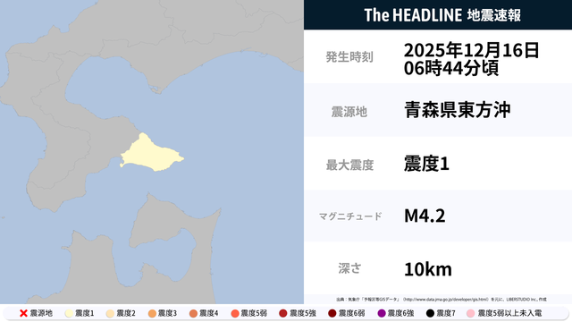 12月16日6時44分頃、青森県東方沖を震源とするマグニチュード4.2の地震が観測された。最大震度1を観測したのは、北海道。