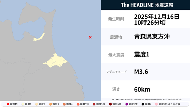 12月16日10時26分頃、青森県東方沖を震源とするマグニチュード3.6の地震が観測された。最大震度1を観測したのは、青森県。