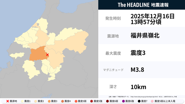 12月16日13時57分頃、福井県嶺北を震源とするマグニチュード3.8の地震が観測された。最大震度3を観測したのは、福井県。
