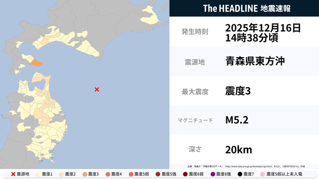 12月16日14時38分頃、青森県東方沖を震源とするマグニチュード5.2の地震が観測された。最大震度3を観測したのは、北海道。
