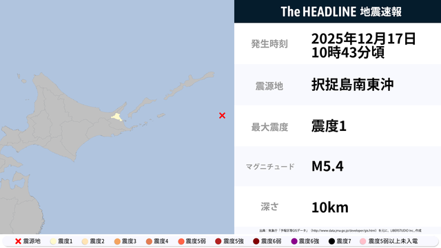 12月17日10時43分頃、択捉島南東沖を震源とするマグニチュード5.4の地震が観測された。最大震度1を観測したのは、北海道。