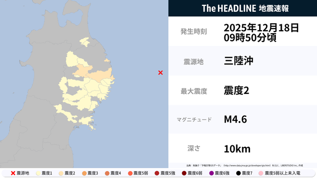 12月18日9時50分頃、三陸沖を震源とするマグニチュード4.6の地震が観測された。最大震度2を観測したのは、岩手県。