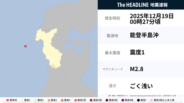12月19日0時27分頃、能登半島沖を震源とするマグニチュード2.8の地震が観測された。最大震度1を観測したのは、石川県。