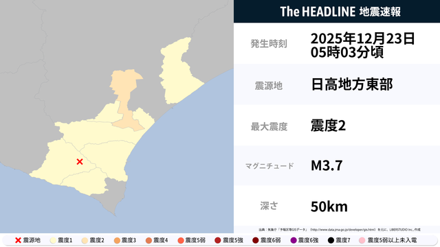 12月23日05時03分頃、日高地方東部を震源とするマグニチュード3.7の地震が観測された。最大震度2を観測したのは、北海道。