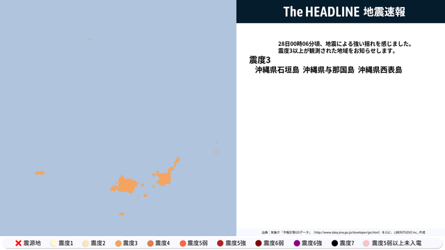 12月28日0時6分頃、沖縄県石垣島・沖縄県与那国島などで震度3以上の地震を観測した。現時点の発表では、沖縄県石垣島・沖縄県与那国島などで最大震度3の観測が発表されている。