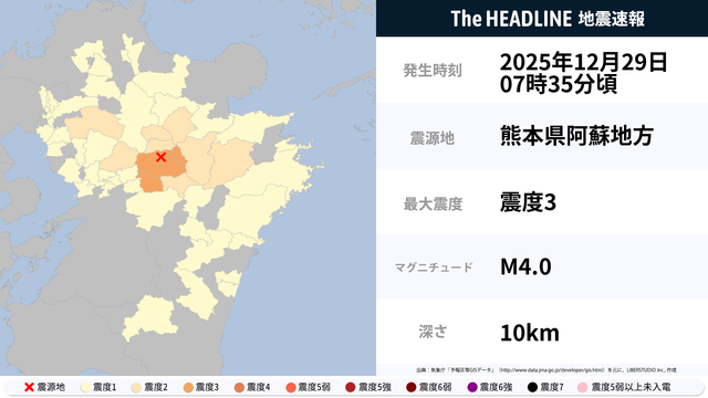 12月29日07時35分頃、熊本県阿蘇地方を震源とするマグニチュード4.0の地震が観測された。最大震度3を観測したのは、熊本県。