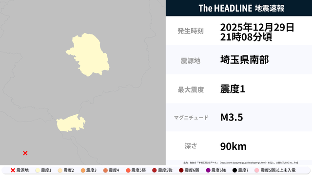 12月29日21時8分頃、埼玉県南部を震源とするマグニチュード3.5の地震が観測された。最大震度1を観測したのは、茨城県・栃木県。