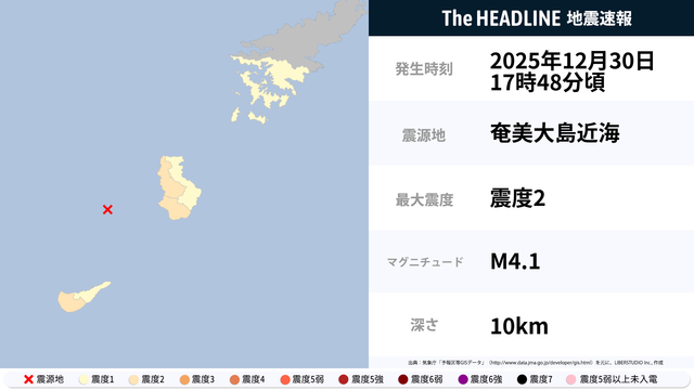 12月30日17時48分頃、奄美大島近海を震源とするマグニチュード4.1の地震が観測された。最大震度2を観測したのは、鹿児島県。
