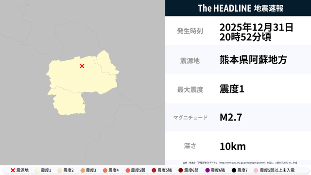 12月31日20時52分頃、熊本県阿蘇地方を震源とするマグニチュード2.7の地震が観測された。最大震度1を観測したのは、熊本県。