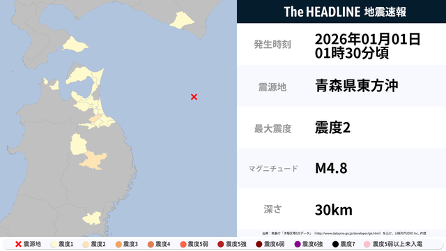 1月1日1時30分頃、青森県東方沖を震源とするマグニチュード4.8の地震が観測された。最大震度2を観測したのは、青森県・岩手県。