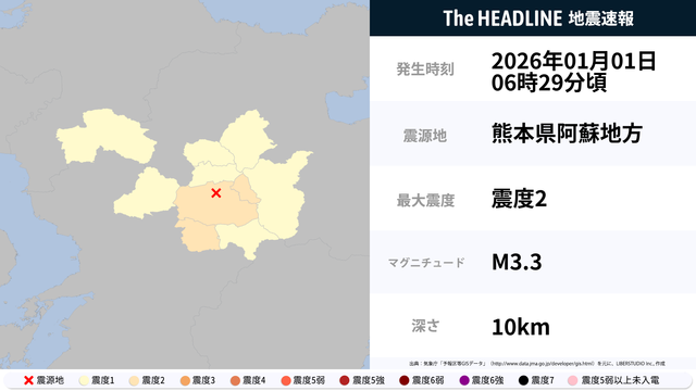 1月1日6時29分頃、熊本県阿蘇地方を震源とするマグニチュード3.3の地震が観測された。最大震度2を観測したのは、熊本県。