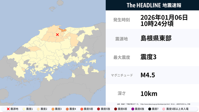 01月06日10時24分頃、島根県東部を震源とするマグニチュード4.5の地震が観測された。最大震度3を観測したのは、鳥取県。