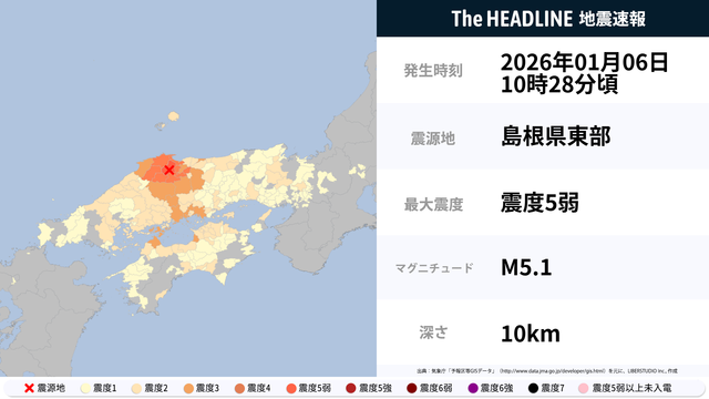 1月6日10時28分頃、島根県で最大震度5弱の地震を観測