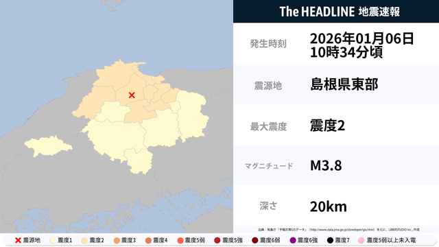 01月06日10時34分頃、島根県東部を震源とするマグニチュード3.8の地震が観測された。最大震度2を観測したのは、鳥取県・島根県。