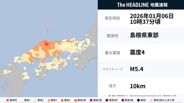 01月06日10時37分頃、島根県東部を震源とするマグニチュード5.4の地震が観測された。最大震度4を観測したのは、鳥取県・島根県。