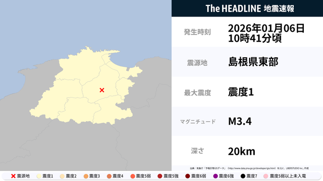 01月06日10時41分頃、島根県東部を震源とするマグニチュード3.4の地震が観測された。最大震度1を観測したのは、鳥取県・島根県。