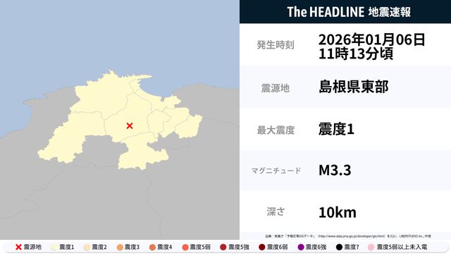 01月06日11時13分頃、島根県東部を震源とするマグニチュード3.3の地震が観測された。最大震度1を観測したのは、鳥取県・島根県。